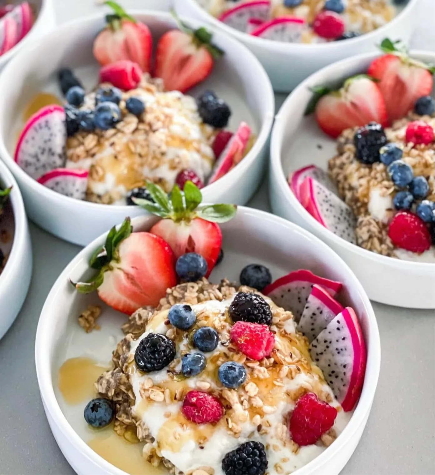 Greek yoghurt, fruit and granola parfaits with warm rolled oats