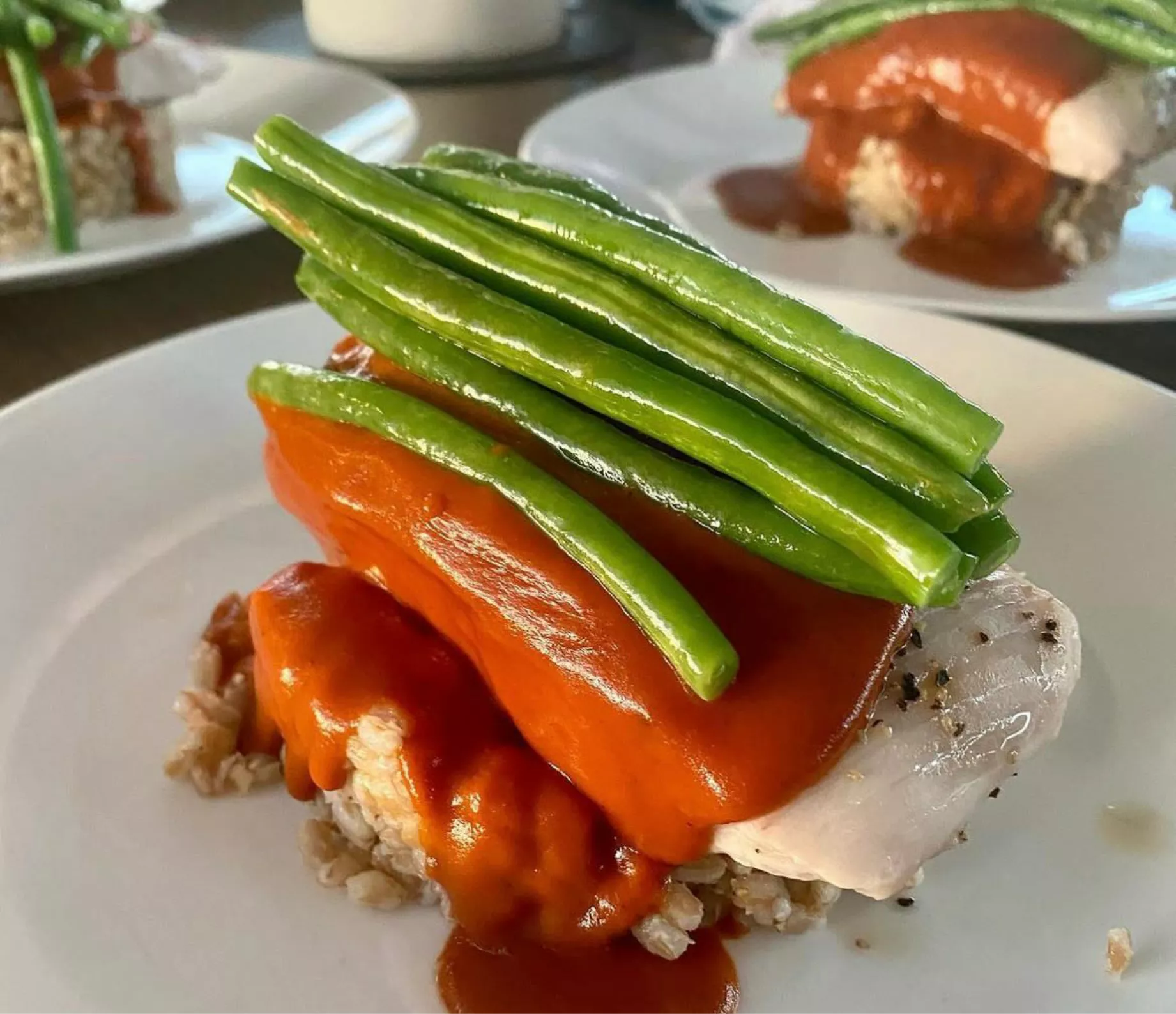 Baked BranzinoBranzino over Moroccan couscous with lemon-zest green beans